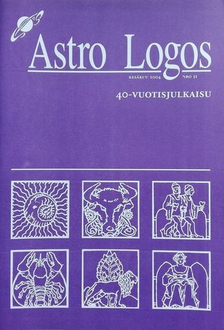 SISÄLLYS 5. Pääkirjoitus - Rauni A. Nikula 6. Astrologian sata vuotta - Raimo A. NIkula 10. Esoteerisen astrologian historia - Erkki Lehtiranta 13. Symmetrinen astrologia - Esa Hankonen 18. Paikka ja suunta astrologiassa - Annika Sipilä 26. Auringonpaluukarttojen lyhut historia - Anja Mäkinen & Marita Hölttä 28. Auringonpaluukartat - John Lennon - Anja Mäkinen 32. Yritysastrologia - Maarit Laurento 34. Asteroidit ja Kh(e)iron - Marja-Liisa Niemi-Mattila 38. Pluton dramatiikkaa 1900-luvulta - Ulla Palomäki 40. Uusia pieniä taivaankappaleita - Raimo A. Nikula 42. Planetoidi Sedna - Koonnut MArita Hölttä 46. Suomen Astrologinen Seura ry - Olavi J. Asikainen 47. Tuokiokuvia - Olavi Asikainen - Marita Hölttä 57. Astrologinan opiskelu Suomessa - Juhani Nummela 58. Astrologiaa ennen - Sven Stenberg 60. Astrologia silloin ja nyt - Markku Manninen 62. Vähäsen Astrologisen Seuran historiaa - Marita Hölttä 67. S.A.S.:n toimintakertomus vuodelta 2003 69. S.A.S.:n toimintasuunnitelma vuodelle 2004